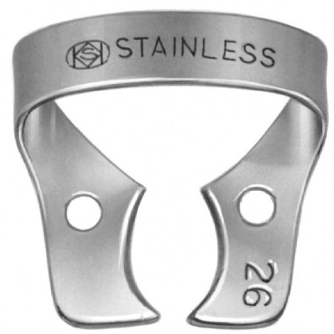 Кламп № 26 для моляров верхней и нижней челюсти. Крылья отсутствуют, среднего размера щечки вогнуты в апикальном направлении. Идеален как якорный кламп на зубы с коронковыми частями среднего размера. Возможна надежная фиксация на сильно разрушенные зубы с небольшой ретракцией краевой десны и десневых сосочков. Широкие щечки обеспечивают хороший обзор со всех сторон и не дают платку, при натяжении, приближаться к коронковой части зуба в момент ее препарирования ротационными инструментами. Производитель: Dentech, Япония.